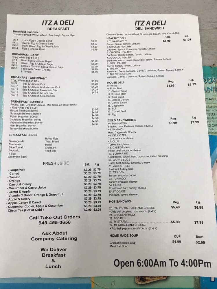 Welcome to Itz-A-Deli, your go-to spot for delicious deli sandwiches and invigorating breakfasts. Nestled at 20651 Lake Forest Dr, Lake Forest, CA, this cozy eatery offers a variety of options that cater to every palate. From hearty breakfast sandwiches like the BK1 Ham, Egg, and Cheese to healthier choices such as the Tuna Healthy Sandwich, each dish is crafted with fresh ingredients that promise satisfaction.